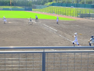 この試合、何より感心したのは試合がとてもスムーズに進行したことでした。終盤に松陽高校のビックイニングが生まれて大差の付いた試合となりましたが、そしてまだまだ残暑厳しい好天の中での試合でありましたが、両チームともイニング交代がきびきびと行われていました。そんな良い緊張感が持続した試合だから、両チームともに好プレーが随所に見られました。